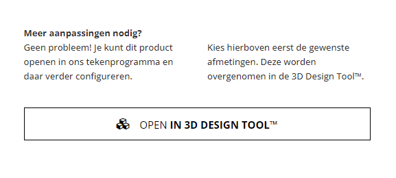 Wist je dat je de DIY-meubels ook kunt aanpassen in de 3D design tool? Ga naar het gewenste product en scoll naar onder waar je onderstaande afbeelding ziet. Het huidige product wordt dan weergegeven in de configurator en kun je helemaal aanpassen.