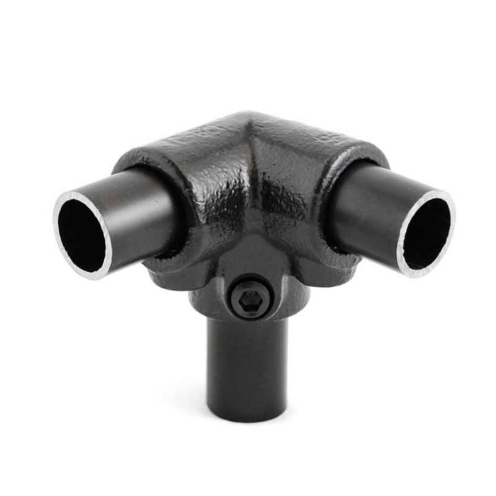 Deze 90° hoekverbinding wordt meestal gebruikt op de hoeken voor de bovenste reling van een relingwerk. Ze kan ook gebruikt worden voor de bovenste hoekverbinding bij bijvoorbeeld werktafels en andere rechthoekige constructies. Diameter 21,3mm.