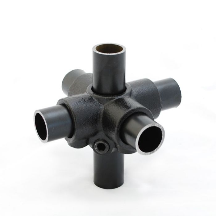 Deze klem verbindt 1 verticale buis en 4 horizontale buizen in vijf richtingen met elkaar. De verticale buis gaat door de koppeling. Ook hier staan de horizontale buizen in een hoek van 90° ten opzichte van de doorgaande, ononderbroken verticale buis. Diameter 42,4 mm.