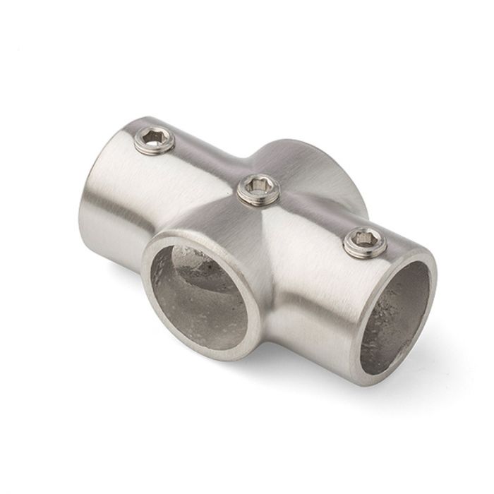 Deze buiskoppeling geeft een 90 graden verbinding tussen drie steigerbuizen in één plat vlak. Een ononderbroken steigerbuis gaat door de koppeling heen en twee buizen lopen dood. Geschikt voor RVS/INOX steigerbuis diameter 28,0mm