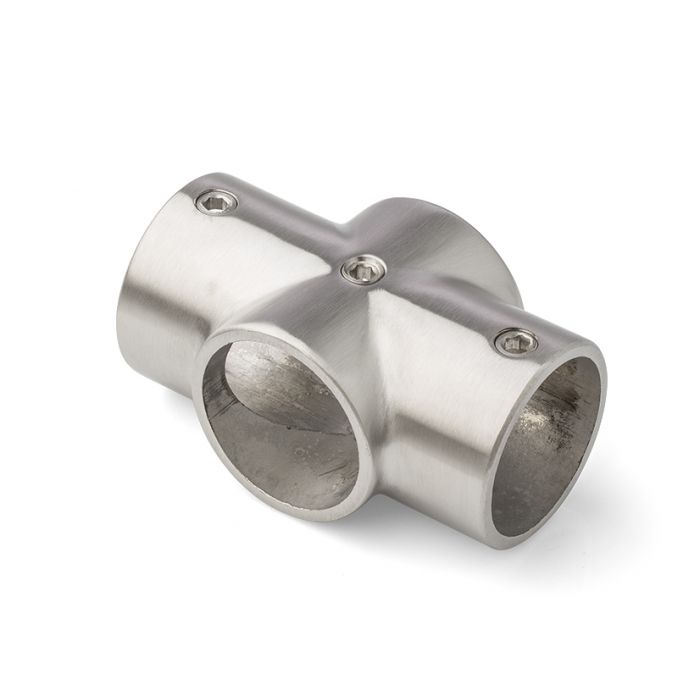 Deze koppeling geeft een 90° verbinding tussen drie buizen in één plat vlak. Eén ondoorbroken buis gaat door de koppeling heen en twee buizen lopen dood. Diameter 42,4mm.