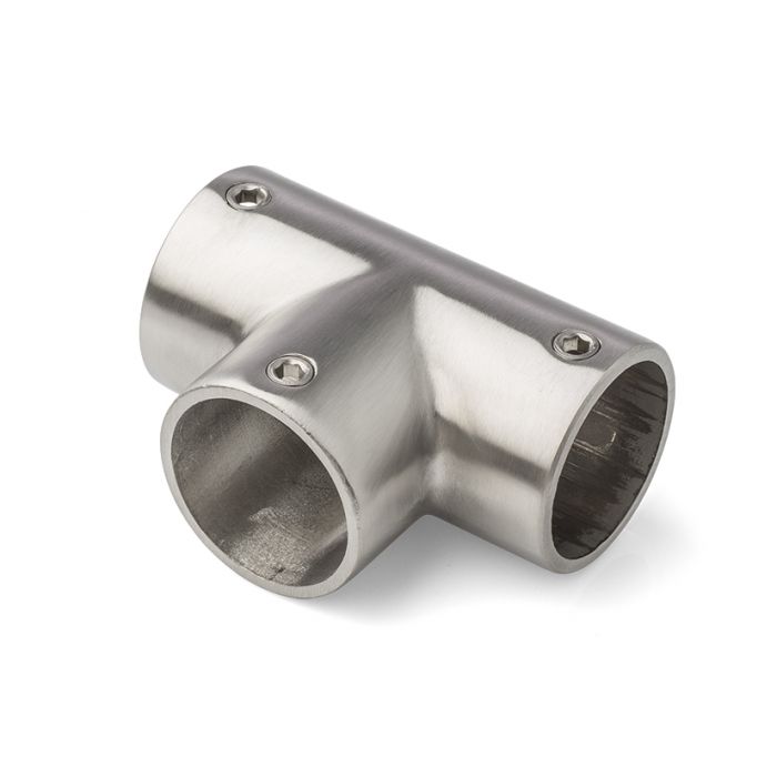 Dit type kan worden gebruikt om een vaste verbinding van 90° te maken tussen 2 buizen. Er zitten in de doorgaande verbinding twee inbusbouten waardoor de koppeling gebruikt kan worden op plaatsen waar ook twee buizen aan elkaar verbonden moeten worden. Diameter 42,4mm.