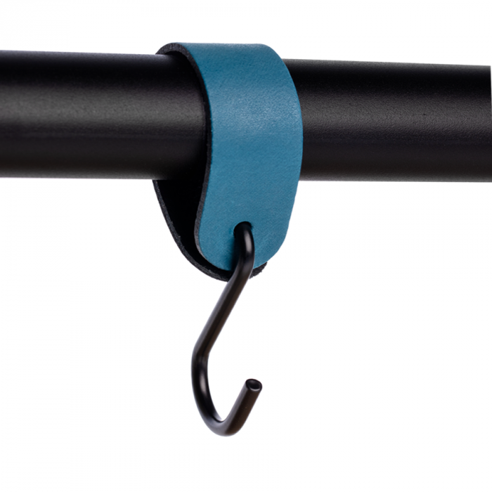 Mooie zwarte S-haak aan een leren lus in de kleur petrol. S-haken zijn voor vele doeleinden te gebruiken en staan heel decoratief. Te gebruiken voor aan de kapstok, een keukenrekje, of in de kledingkast.