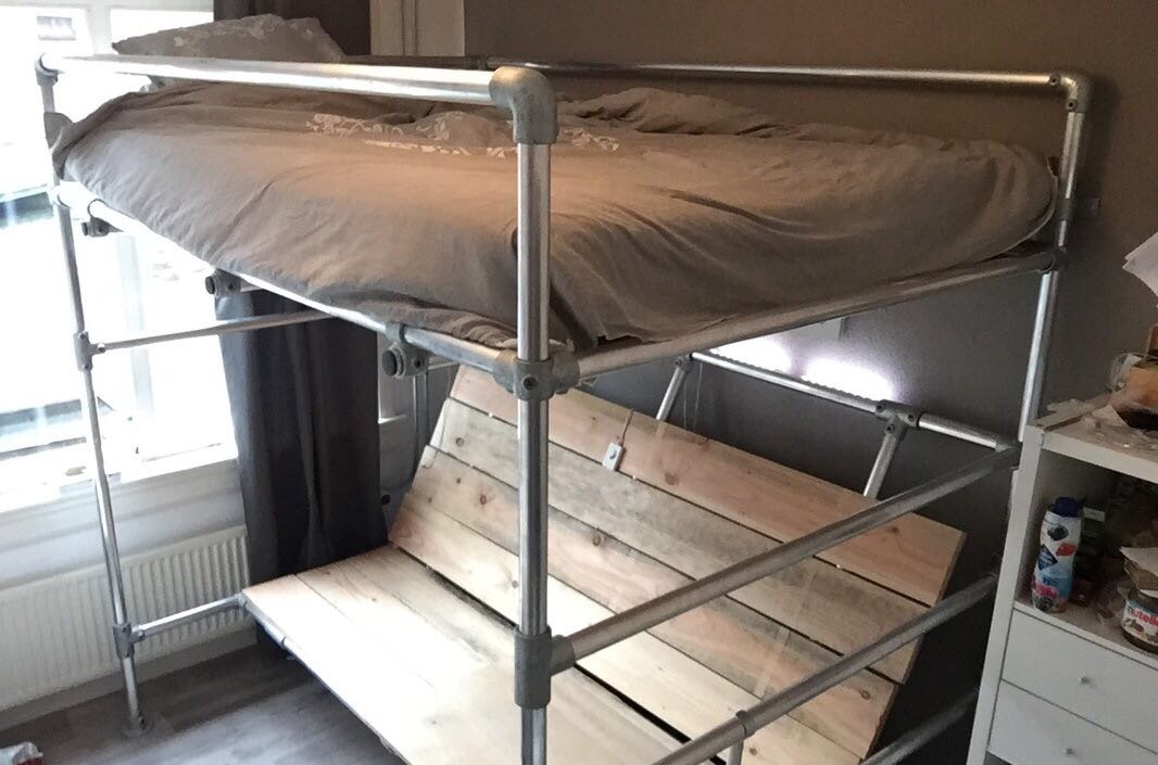 Zelf een mooi (kinder)bed of hoogslaper maken van steigerbuizen? Bekijk dan eens de mogelijkheden die steigerbuizen en buiskoppelingen je bieden. Alles eenvoudig zelf samen te stellen en op maat te bestellen.