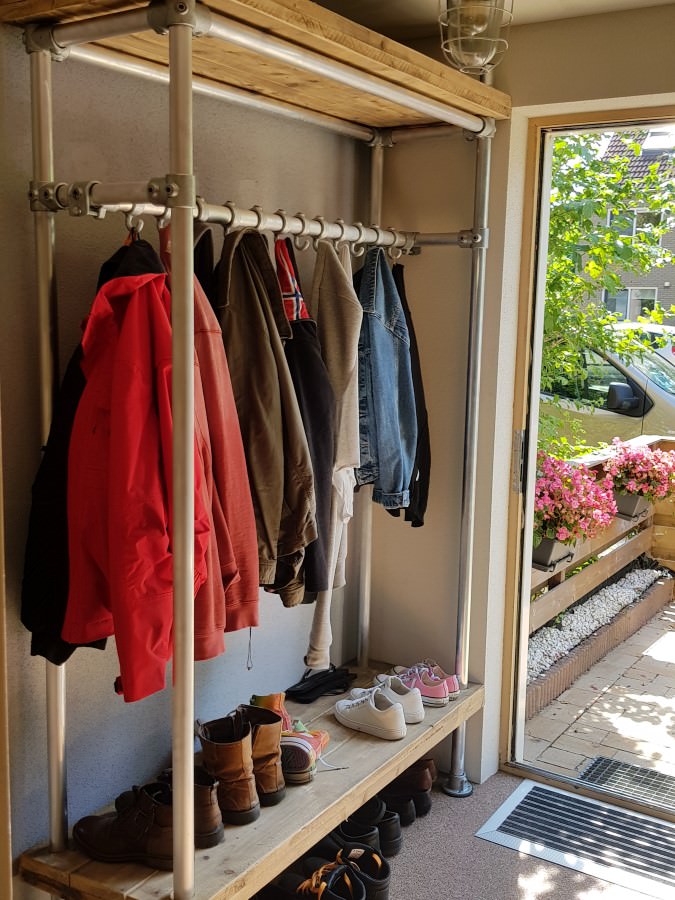 Mocht jouw perfecte kapstok niet als DIY pakket beschikbaar zijn kun je eenvoudig zelf een kapstok maken van steigerbuizen. Om te beginnen bedenk je hoe groot de kapstok gaat worden en wat voor design je gaat kiezen. Vanzelfsprekend kunnen wij je helpen met het uittekenen van jouw droomkapstok. Vervolgens kies je het type steigerbuis en selecteert de juiste maten. Wij zagen deze buizen gratis voor je op maat! Om de buizen aan elkaar te koppelen heb je ook buiskoppelingen nodig. Bij de buiskoppelingen zijn tevens haakjes te vinden die je voor jouw kapstok kunt gebruiken. Eventueel kun je de kapstok ook afwerken met ons steigerhout.